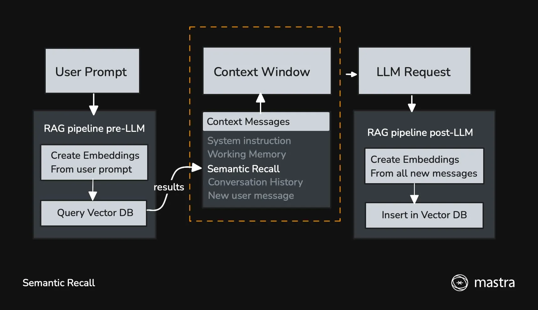友人に先週末何をしたか尋ねると、彼らは「先週末」に関連する出来事を記憶の中から検索し、それから何をしたかを教えてくれます。これはMastraにおけるセマンティックリコールの仕組みに少し似ています。