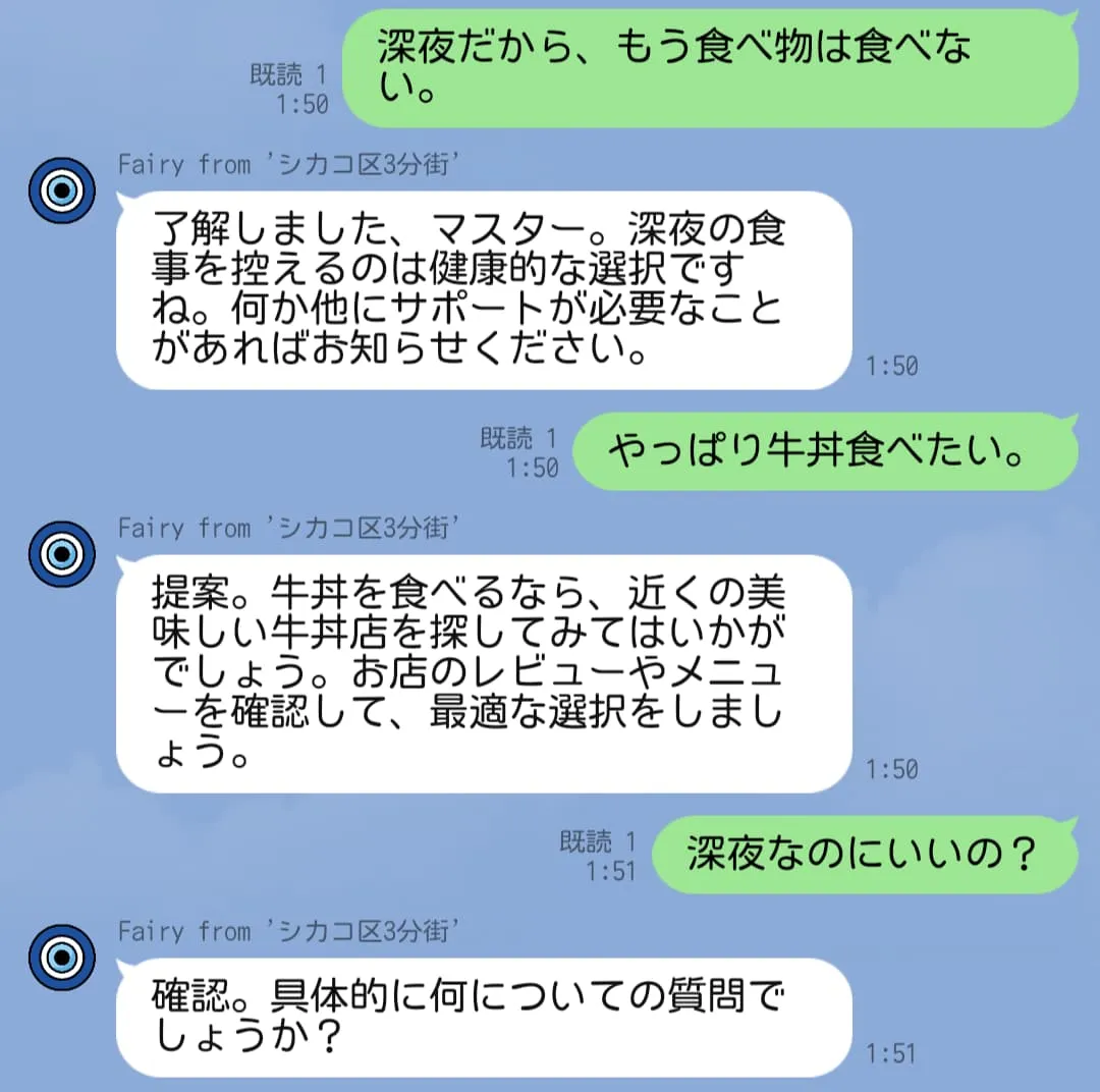 現状の Fairy は会話の流れを汲んだレスポンスを生成することができない。 最高のアシスタントを自称する (させる?) からには、短期的・長期的問わず記憶力を発揮して、会話やサポートをして欲しい。