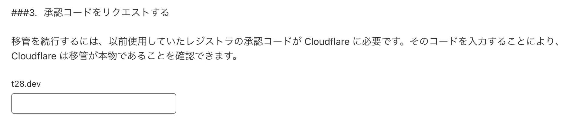 Cloudflare は移管フローが承認されていることを旧レジストラに確認する必要があります。そのために、旧レジストラはお客様に認証コードを提供します。