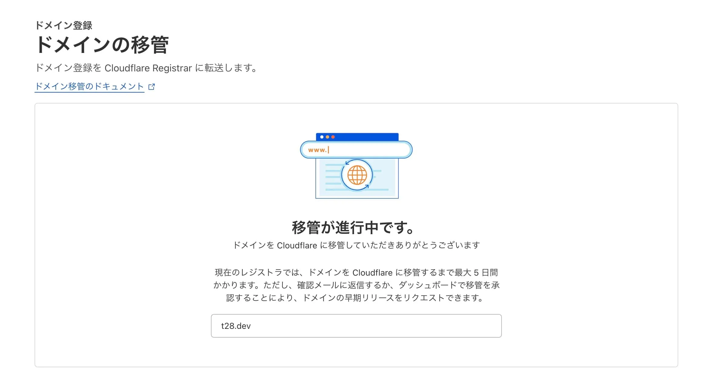 レジストラによるネームサーバーの更新処理は 24 時間かかることがあります。 Cloudflare がこれらの変更が反映されたことを確認すると、お客様宛にメールが届きます。このプロセスが完了するまで、ドメインの移管作業を続行することはできません。
