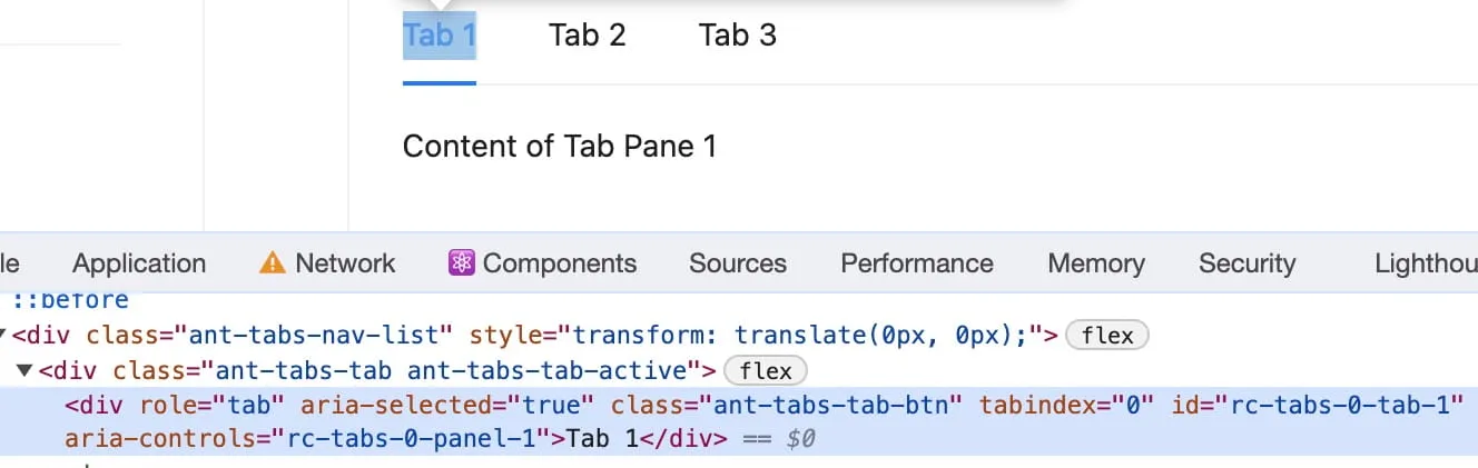 Ant Design Vue の Tabs では、role="tab" 要素に id="rc-tabs-0-tab-1" が設定されている。