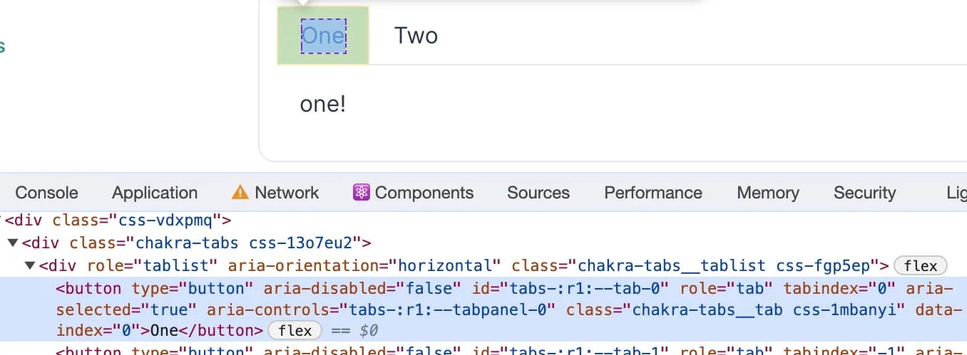 Chakra UI の Tabs では、role="tab" 要素に id="tabs-:r1:--tab-0 が含まれている。